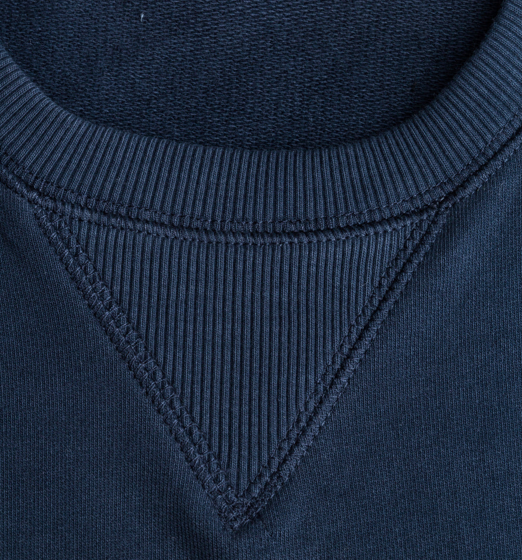 We built this sweater with the same 14 ounce French Terry cotton as our Hoodie. Its substantial weight makes it durable, yet the 100% cotton French Terry breathes, allowing it to be worn any time of year. All seams are reinforced with 5-needle stitching. The 2 x 1 ribbed side panels provide maximum comfort and fit. The collar, v insert, cuffs and waistband all share the same 2 x 1 rib. The 5-needle stitch finishes the v-insert with precision making this a stylishly elevated sweater.
